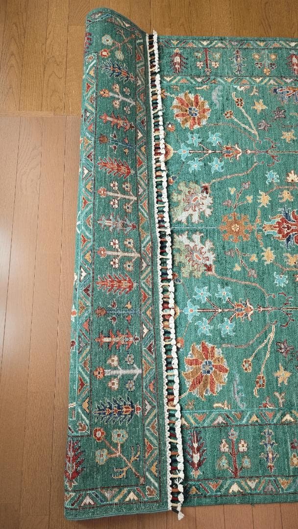 【Turkish Vintage Rug|トルコヴィンテージラグ】1970s|約163cm × 263cm 細やかなボタニカル模様が一面に広がる、超大判サイズのヴィンテージラグ。中心にはやわらかな存在感のメダリオンが配され、全体を静かにまとめながらも、どこか自然体で肩の力が抜けた佇まいが魅力です。くすんだグリーンやブラウンが溶け合い、使い込まれたことで生まれた擦れや濃淡が、奥行きのある表情をつくっています。163×263cmの迫力あるサイズ感は、リビングの主役として空間をしっかりと受け止めてくれる存在。ナチュラルな床や木家具と相性が良く、観葉植物やリネン素材とも自然に馴染みます。カジュアルでありながら、どこか大人の余裕を感じさせる雰囲気は、量産品では決して出せないヴィンテージならでは。華美ではないのに、しっかりと「センスがいい」と伝わる一枚。日常の暮らしに寄り添いながら、空間を静かに格上げしてくれる、カッコよさと心地よさを併せ持ったラグです。Details・素材:手紡ぎオーガニックウール & コットン|植物・野菜由来の天然染料使用・産地:トルコ・アナトリア地方(1970年代)・輸入後未使用/現地にてハーブラグシャンプー洗浄済み・特別なクリッパーで毛足を整え、使いやすい状態でお届けしますご購入前にご確認ください・ヴィンテージラグはすべて一点ものの手織りです。使用感、擦れ、糸のほつれ、補修跡、色むら、毛羽立ちなどが見られることがあります。これらを“個性”としてお楽しみいただける方におすすめいたします。・ウール特有の香りが残る場合がございますが、風通しの良い場所で干すことで自然と薄れていきます。・ウールは「夏は涼しく、冬は暖かい」優れた天然素材。年中通して快適にお使いいただけます。・モニターやご覧いただく環境により、実際の色味と異なって見える場合がございます。プロフィール、ご一読お願いします。