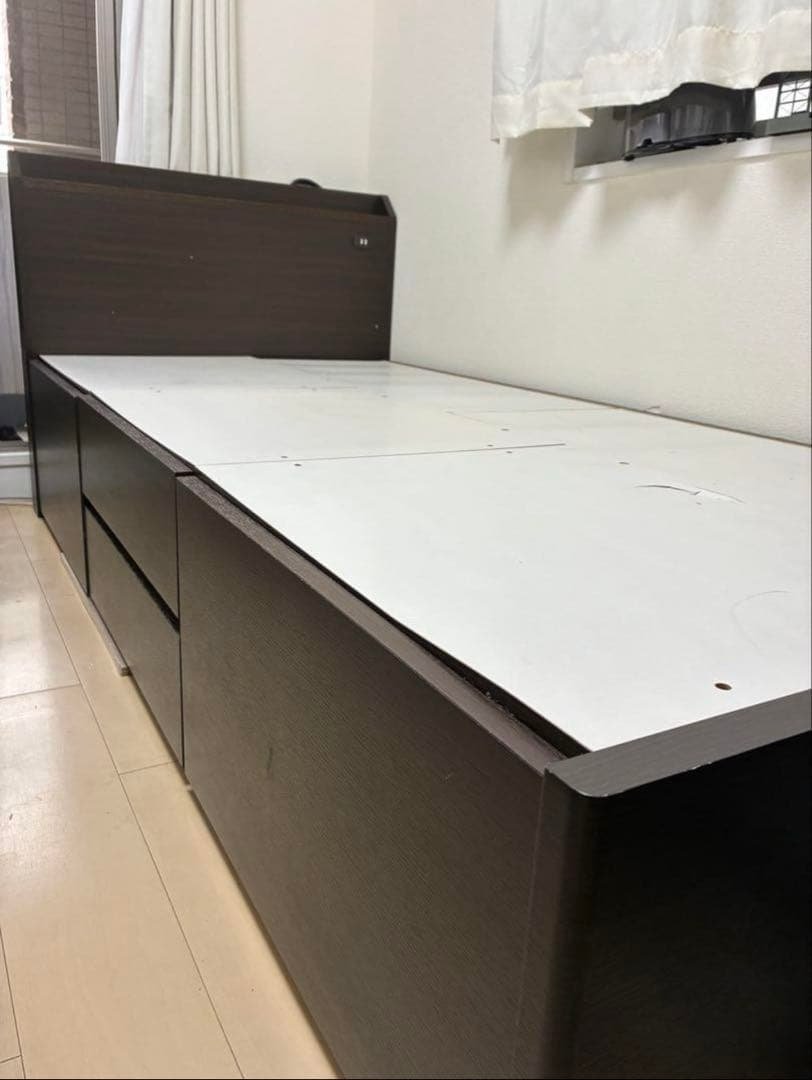 - かなり重たいですが、女性1人でも組み立てられました。 軋むこともないです。 ベッドボードのカムロックがなかなか強敵でした。 あと、一部えぐれてる部分がありましたが、裏側だったのと、安くて強そうなベッドだったので星4です。